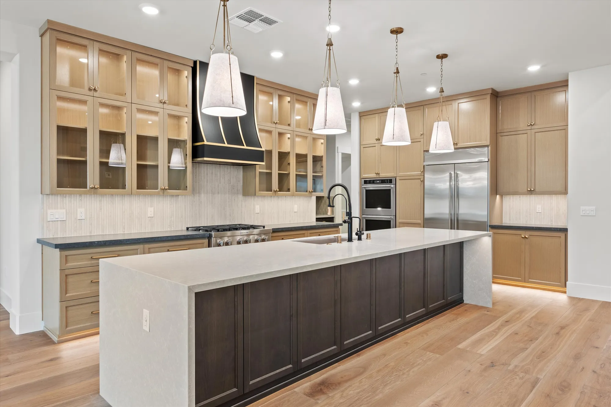 Wood is the classic choice, but it’s far from your only option. Glass-front doors let you display your favorite dishes or cookbooks. And if you love the richness of darker tones, woods like cherry or walnut create a warm, intimate atmosphere—a trend that’s gaining popularity in American kitchens.